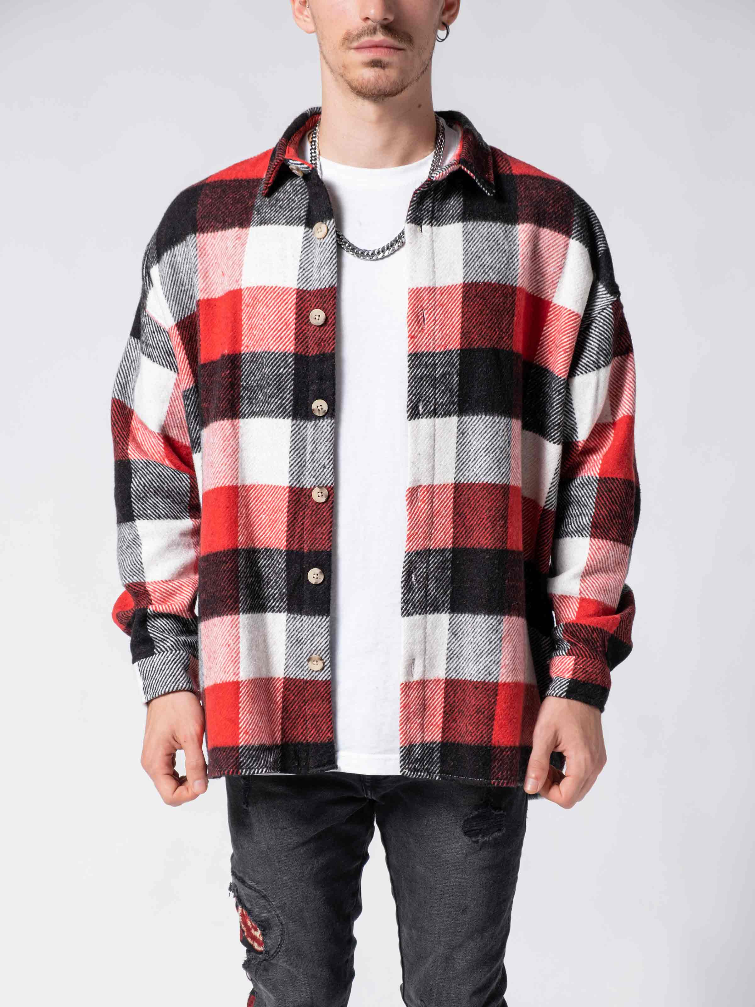 Flannel Shirt is made from high-quality custom plaid is a woven fabric. It has a casual oversize fit and dropped shoulders. The shirt has pleats at the waist, an adjustable button closure, and as you can see on the front it has double pockets with buttons