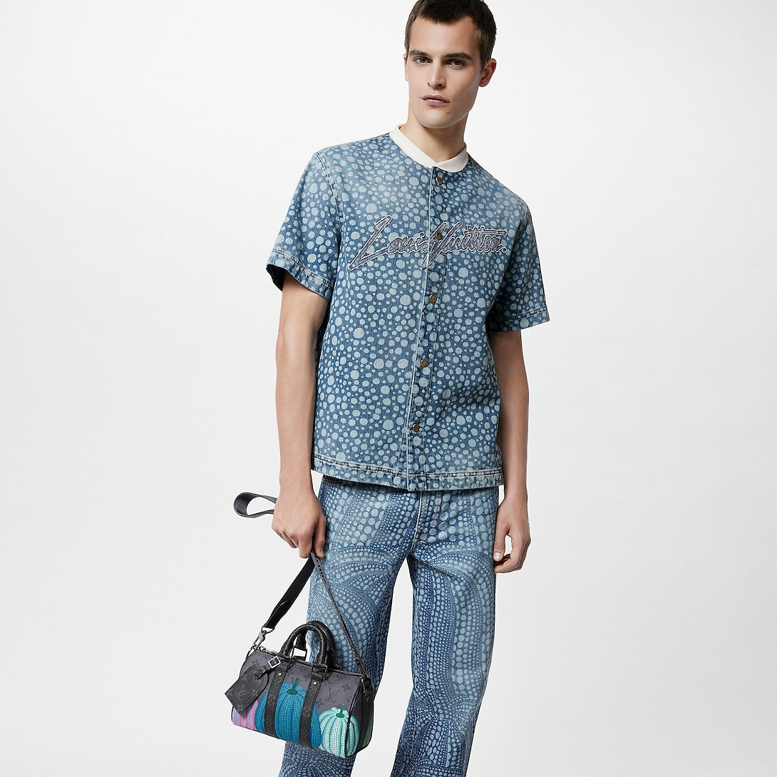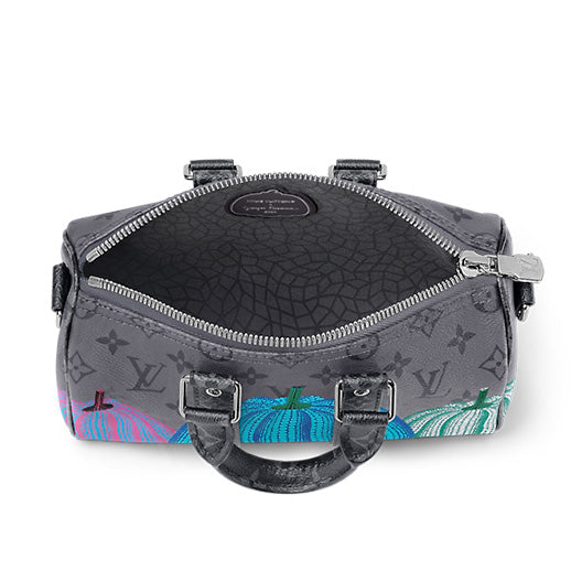 A scaled-down version of a classic travel bag, the LVxYK Keepall 25 joins the second Louis Vuitton x Yayoi Kusama collection with a playful new look. Monogram Eclipse Reverse canvas is printed with vibrant, colorful pumpkins – an emblematic theme in Kusam