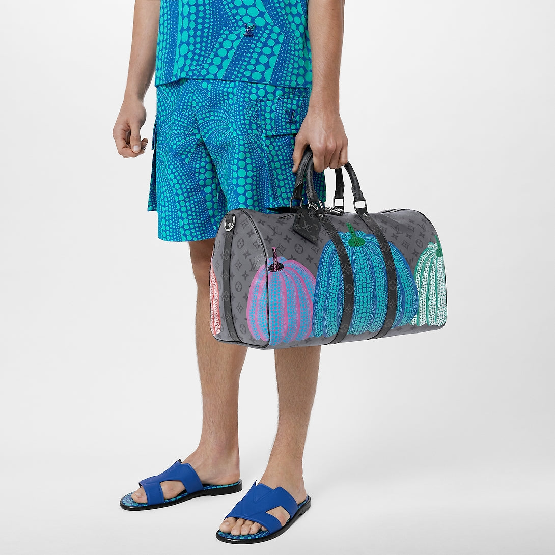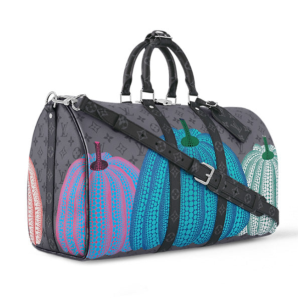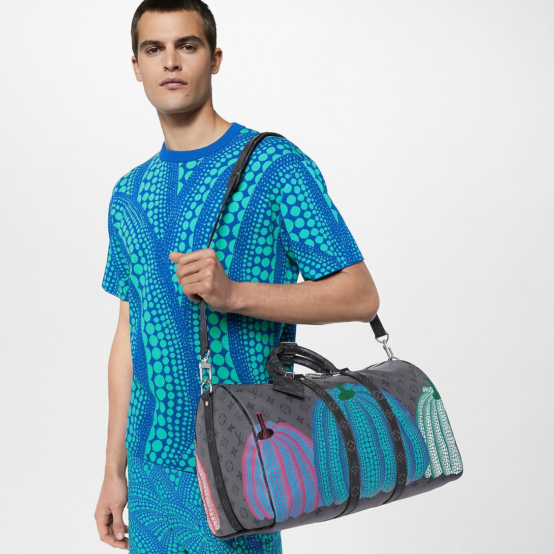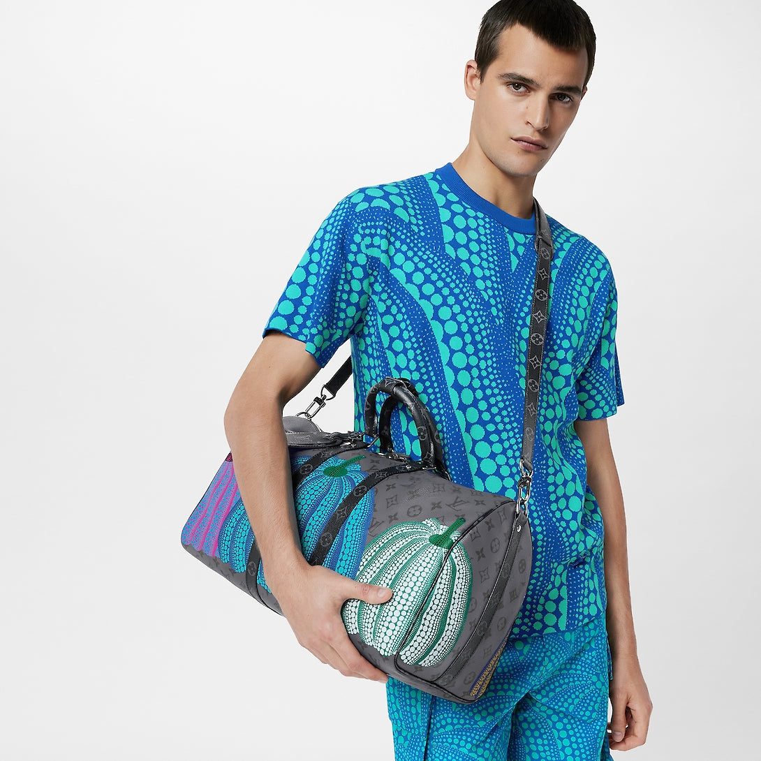 A scaled-down version of a classic travel bag, the LVxYK Keepall 25 joins the second Louis Vuitton x Yayoi Kusama collection with a playful new look. Monogram Eclipse Reverse canvas is printed with vibrant, colorful pumpkins – an emblematic theme in Kusam